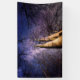 This design features a beautiful image of two tall trees rising up into the sky, surrounded by other trees in a forest. The scene is set at night-time when everything looks particularly magical and enchanting. There is a flock of birds in flight overhead. The sky is made up of a beautiful mixture of purple and blue; it is dotted with bright white stars.