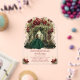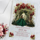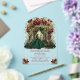 Celebrate her magical milestone with this elegant Emerald Floral Arch Quinceañera invitation, beautifully printed on a modern clear acrylic card. This stunning design features a graceful young woman in an emerald green ball gown standing beneath a luxurious arch of deep red flowers and lush greenery. Glowing lanterns and a dreamy forest backdrop add a magical, fairytale ambiance.