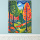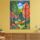 A vibrant linocut print in a folk art style inspired by Marc Chagall, depicting a whimsical forest scene. Fantastical trees, vibrant colours, and playful details evoke a sense of magic and wonder.