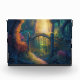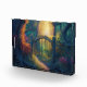 Stylish acrylic block features an AI generated digital art image of a magical forest garden gate with sun ray beaming in background.