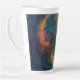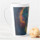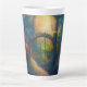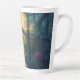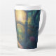 Artistic latte mug features an AI generated digital art image of a magical forest garden gate with sun ray beaming in background.