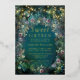 A whimsical watercolor illustration of lush foliage in emerald green and mauve and purple, sparkling bright with fairy lights and magic dust, decorates this spring summer fall Sweet 16 invitation with an enchanted forest theme that also features a frame of delicate roses in pink, purple and mauve. The text, as well as the lights, were produced with real gold foil. An elegant, modern invitation for a fairytale sixteenth birthday. Perfect for girls and families who love the fairytale forest setting, the fairy forest or fairy garden theme and emerald green, mauve and gold.