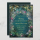 This enchanted forest wedding invitation features lush, wild greenery, hanging foliage, and tree branches draped with fairy lights in a faux gold effect, creating a romantic, magical atmosphere. A frame of fuchsia pink, purple, and cream roses adds a luxurious floral touch, while the glittering emerald green background enhances the mystical, fairytale aesthetic. Perfect for a spring, summer, fall, or winter wedding, this elegant, modern invitation is ideal for brides who adore a fairy forest setting, woodland weddings, fairy garden themes, romantic rose designs, and a colour palette of emerald green and gold. Whether you're planning a mystical fairytale wedding, a botanical-inspired ceremony, or a whimsical woodland celebration, this luxurious floral invitation captures the magic of a dreamy forest wedding
