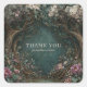 Step into a fairytale world with this enchanting forest thank you sticker. The design features a stunning, painterly landscape of a magical woodland clearing, rendered in a rich, moody palette of deep greens, browns, and dusty pinks. Two majestic, ancient trees with gnarled, intertwining roots form a beautiful natural arch, their branches laden with delicate white blossoms. The lush forest floor is bursting with life, featuring large, romantic dusty pink peonies, smaller blossoms, intricate vines, and rich foliage. This detailed botanical scene surrounds a deep, textured teal-green background, creating a sense of mystery and enchantment. These stickers are perfect for businesses that evoke storytelling, nature, and a touch of magic, such as fantasy authors or illustrators, boutique florists with a romantic style, rustic wedding venues or planners, artisanal craftspeople, or apothecaries. This versatile design can also be used to beautifully seal envelopes for woodland-themed weddings or parties, or as a sophisticated accent on party favors and gift wrapping.