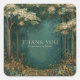 Step into a fairytale world with this enchanting forest thank you sticker. The design features a stunning, painterly landscape of a magical woodland path, rendered in a rich palette of deep teal-green, earthy browns, and rustic golds. Majestic trees with detailed bark, blooming with delicate creamy white blossoms, frame a serene clearing. The lush forest floor is depicted with abundant undergrowth, featuring ferns and foliage in golden-brown and rust tones. A magical cascade of tiny, sparkling gold lights, like fireflies, floats through the air, adding to the scene's enchantment. A minimalist, thin, textured gold square frame provides a sophisticated border for your message. These stickers are perfect for businesses that evoke nature, storytelling, and rustic charm, such as fantasy authors or illustrators, rustic wedding venues or planners, artisanal craftspeople, nature photographers, or boutique bookstores. This versatile design can also be used to beautifully seal envelopes for woodland-themed weddings or parties, or as a sophisticated accent on party favors and gift wrapping.