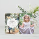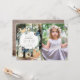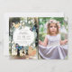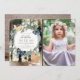This whimsical and cute girl's birthday invitation features your photo and a wreath of white flowers and green foliages with blue butterflies and woodland animals which are a fox and a squirrel on an enchanted forest background. The reverse side features brown wood patterns. Perfect for an outdoor celebrations in the garden, backyard, forest, or the park. Personalise it for your needs. You can find matching products at my store.