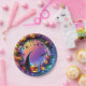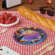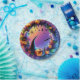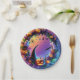 This vibrant Halloween-themed illustration features a central scene with carved pumpkins displaying various expressions, a witch’s hat, and ghosts. Surrounding this are more pumpkins, autumn leaves, spiders, spider webs, and bats against a backdrop that transitions from purple to orange, suggesting a sunset or twilight setting. Perfect for adding a touch of Halloween magic to any setting, these paper plates are ideal for parties and celebrations.