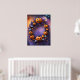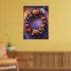 Add a touch of magic to your Halloween decor with this enchanting poster. Featuring a beautifully crafted wreath made of purple and blue branches, adorned with glowing orange and blue pumpkins, this artwork captures the spooky yet festive spirit of Halloween. The full moon, flying bats, and scattered autumn leaves in the background enhance the eerie atmosphere, making it a perfect addition to your seasonal decorations.