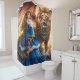 A magical fantasy artwork of a regal princess in a blue gown standing beside a majestic jeweled lion with wings, glowing in a golden, fairytale light.