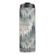 This fantastical scene thermal tumbler features a dark, towering castle with glowing windows nestled in a misty forest of blue and grey tones. Surrounded by slender evergreens, bare-branched trees, and soft blossoms in pink and orange, the landscape shimmers with subtle specks of magical light. The twilight ambiance and ethereal details create a whimsical, mysterious atmosphere, perfect for lovers of fantasy, fairytales, and dreamlike forest settings.