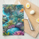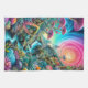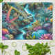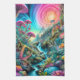 A surreal fantasy landscape featuring glowing mushrooms, vibrant alien flora, a cascading waterfall, and a mesmerising swirling sun in the sky. The scene is rich in colours and intricate details, evoking a dreamlike and otherworldly atmosphere
