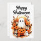 This charming Halloween illustration radiates playful warmth and seasonal cheer. A friendly ghost peeks out from behind a smiling jack-o’-lantern, surrounded by a lush bouquet of autumn leaves and blooming orange and white florals. A second ghost floats nearby, adding soft whimsy to the composition. The “Happy Halloween” script at the top—rendered in flowing black cursive—offers an elegant touch that balances the design’s cosy rustic charm. Perfect for greeting cards, stickers, or party signage, this scene invites joy over fright with its gentle colour palette and floral flair.