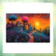 This vibrant and fantastical artwork portrays a magical village nestled on a hillside under a breathtaking sunset. A glowing full moon or sun, radiating warmth, dominates the fiery orange and red sky, studded with twinkling stars. A winding, reddish path meanders through a riot of colourful wildflowers and grasses in shades of blue, purple, and pink. Traditional-style houses with glowing windows dot the landscape, leading up to a cluster of homes at the crest. Strikingly coloured trees, including a prominent electric blue and a vivid fuchsia, add to the whimsical and surreal atmosphere of this dreamlike scene.