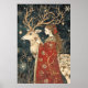The image depicts an enchanting scene featuring a woman dressed in an ornate, crimson cloak adorned with golden patterns. Her long brown hair is elegantly styled, with floral and ribbon accents. She is gently touching a deer with intricate, branching antlers, decorated with ornaments. Snowflakes and starry patterns surround them, evoking a magical, wintery atmosphere. The artwork blends a mystical, fairytale-like charm with a holiday season ambiance, featuring a delicate, illustrative style.