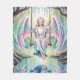 A soft pastel digital illustration of an ethereal angel with long flowing white hair and a serene expression, gently seated on a wooden swing. The angel's wings shimmer with an iridescent, pearlescent sheen, reflecting soft pinks, blues, and greens as they gently sway. Below, a tranquil pool of water mirrors her image, surrounded by the roots of two ancient willow trees, their branches gracefully arching overhead. The scene is bathed in a gentle, diffused light, creating a dreamlike atmosphere and sense of peaceful reflection.
