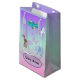 Are you invited to a baby shower? Consider this adorable design featuring critters and butterflies. At the top of the design is a turquoise banner with the words "baby shower." Peeking through the banner are a green owl, a brown bear's head, and a brown lion. To the side of the banner are a purple-blue hippo and a white unicorn with a purple and blue mane and tail. A stream of faded purple butterflies flies upward towards the unicorn. At the edge of the butterflies are a giraffe and an elephant. On the front of the bag is the mother-to-be's name. On the back of the bag, you can replace it with your name as the gift giver. The background colour is a blend of purple, pink, and green.