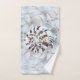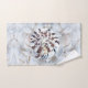White pearly sea shells serve the backdrop of this sea shell themed towel set. Three different types of sea shells are showcased in front of the sea shell backdrop. Perfect for any sea-shell beach themed bathroom. Trendy and enchanting