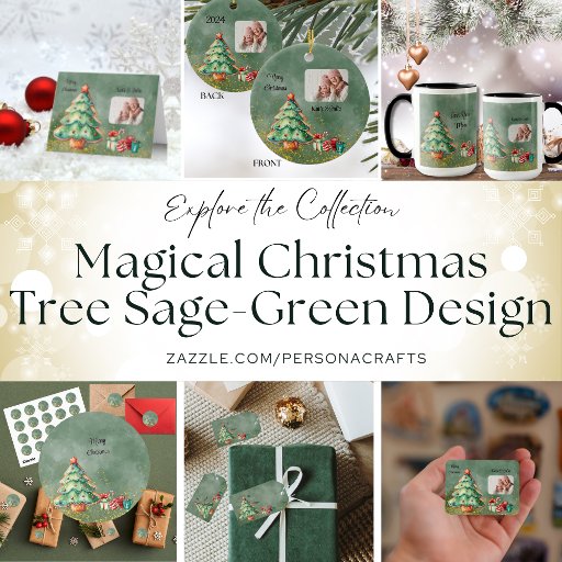 A cheerful holiday card showcasing a whimsical watercolor Christmas tree against a sage-gree background. Delicate gold sparkles dance across the scene, adding a magical touch. Surrounding the tree are beautifully wrapped presents in a variety of fun patterns and ribbons. Cosy cups of cocoa sit nearby, inviting warmth and joy. This card also features your personal photo, making it a delightful keepsake for celebrating joyful memories this holiday season.