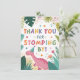Express your gratitude with these adorable dinosaur-themed thank-you cards! Featuring a cheerful pink dino wearing a party hat, vibrant tropical leaves, and playful text that says, "Thank You For Stomping By!"—these cards are perfect for sending heartfelt thanks to your party guests. The colourful and whimsical design makes them a delightful keepsake for any dino-themed celebration. Add a personal touch with your message inside to make your guests smile!