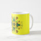 Basic white mug decorated with the "Encouragement design. Design is surrounded by a yellow background and it is trimmed with a green border.