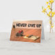 Card features a mouse with a red helmet attempting to steal a piece of cheese from mouse trap and the words "Never give up" in black font.
