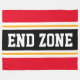 This sporty, athletic design features bold END ZONE text inside a highlighted wide black stripe with double white and yellow racing stripes against bright red outer stripes. The text can be personalised.