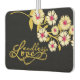 Air freshener with black background, pretty cream and hot pink flowers with golden leaves, and golden text that reads Endless Love.
