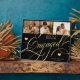 Elegant classic faux gold romantic calligraphy script engaged script couple 3 photo collage, name and engagement date personalised black keepsake plaque.