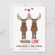 Cute Whimsical Moose saying "it moose be love". This design features engagement cute whimsical fun funny invitations, perfect for weddings engaged couple celebrations celebrate get together, it a humour moose animal heart love, it moose be love quote, a creative unique cool typography font, trendy stylish modern light style, couple husband wife, red cartoon graphic illustration hearts, cute engagement budget postcard