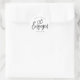 A fun and unique script lettered sticker tailored specifically to you an engagement party. It features the word "engaged" with wedding rings resting over it. Underneath this and above it are the names of the bride and groom and the engagement date.
