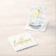 A fun and unique script lettered paper coaster tailored specifically to you an engagement party. It features the word "engaged" with wedding rings resting over it. Underneath this and above it are the names of the bride and groom and the engagement date.