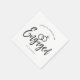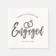A fun and unique script lettered napkin tailored specifically to you an engagement party. It features the word engaged with wedding rings resting about it. Underneath this and above it are the names of the bride and groom and the engagement date.