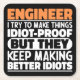 Funny Engineer Sayings "Engineer I Try To Make Things Idiot Proof But They Keep Making Better Idiots". Grab this Funny Engineer design as a funny gifts for an awesome mum, dad or friend.