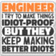 Funny Engineer Sayings "Engineer I Try To Make Things Idiot Proof But They Keep Making Better Idiots". Grab this Funny Engineer design as a funny gifts for an awesome mum, dad or friend.