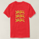 Features the coat of arms of England, three snarling lions on the front middle of the shirt.