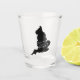 The shot glass features the country map with a scripted font and heart design.