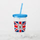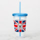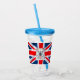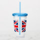 A charming English bulldog is superimposed over a bright, colourful red white and blue British Union Jack on this fun and functional acrylic tumbler with a reusable lid and straw.