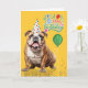 A bright yellow background sprinkled with colorful confetti, a green balloon floating nearby and a happy birthday message accompany this adorable and happy bulldog to send birthday wishes.