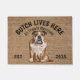English Bulldog Personalised Dog lover welcome doormat. This welcome mat can be personalised with your dog’s name, the slogan can also be changed or you could use a picture of your own dog (make sure it's transparent). Text reads: Butch lives here…. All treats welcome
