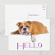 This fun canine postcard features a portrait of a chubby brown and white English Bulldog puppy dog resting against a crisp white background with a hello greeting printed in a vibrant purple font. The back of the postcard is blank for your message.