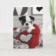 English Bulldog Valentine's card. Cuddly canine set against a contemporary background in red, black and white. No flowers, just hearts and bags of cuteness.