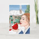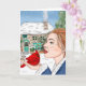 Hand drawn art. The first snow. A lady holding a cardinal on a snowy winter day in front of an English cottage. Blank card.