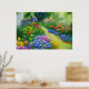 This digital painting is of a charming English cottage garden with borders of colourful flowers along a path, and a white picket fence in the background. It was imagined using AI.
