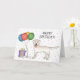 Cute birthday theme design featuring Destei's original cartoon illustration of a cute English cream coat colour Labrador Retriever breed dog. Next to the dog there are colourful birthday balloons tied on a dog bone and a purple and yellow colour present box. The background has a playful pattern of colourful pastel confetti on a white background. There is also a personalizable text area that now reads: "Happy birthday!".