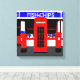 Collage of traditional English icons - red telephone box and red postal box in front of a fish and chip shop. This design has been created using photographs which have been digitally manipulated. The perfect canvas art for the person who loves all things English.