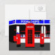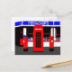 Collage of traditional English icons - red telephone box and red postal box in front of a fish and chip shop. This postcard has been created using photographs which have been digitally manipulated. The perfect postcard for the person who loves all things English. sgb01