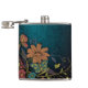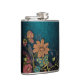Bouquet of wild flowers and butterflies in warm colours on an engraved floral dark blue background.