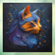 A captivating portrait capturing the beauty of a cat's head looking in style. This abstract artwork features embossed lines in hues of blue, orange, and purple, set against a dark shady blue background. Discover the mystery of this artful feline gaze, adorned with subtle embossed colour elements.