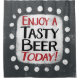 "Enjoy A Tasty Beer Today" is a cute text design in grey with black and red text. It sits on a white accent shape and cute white polka dots surrounding it.