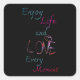 This image features text with a pastel rainbow gradient background. The text reads "Enjoy Life, Love Every Moment" in a casual script font.